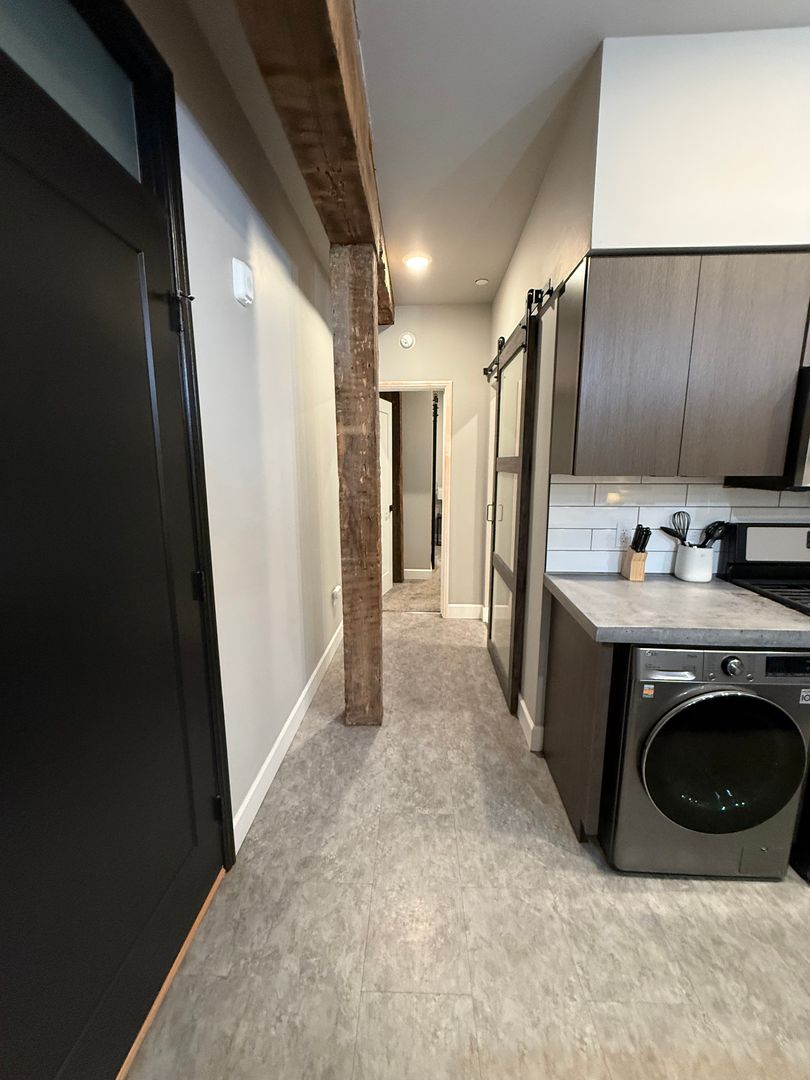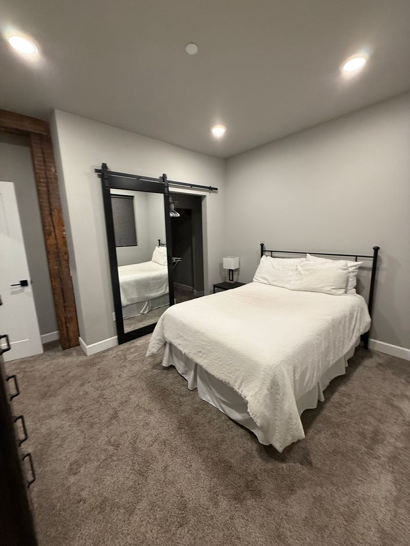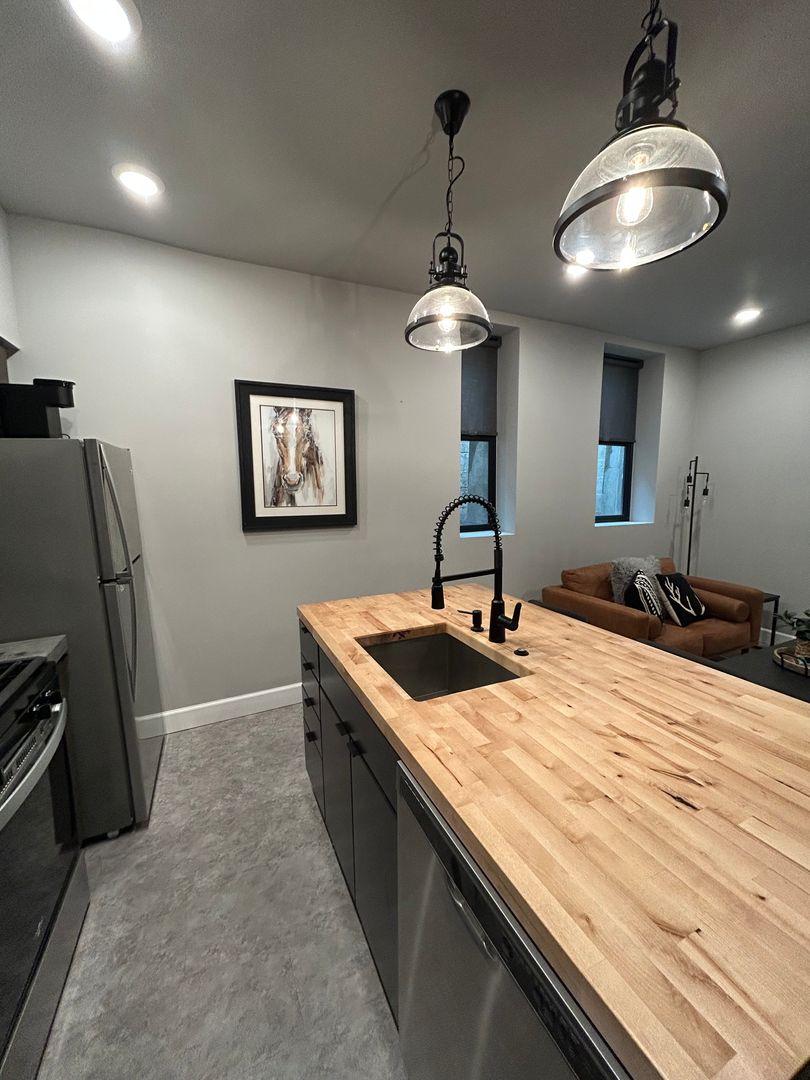 Step into modern comfort in the heart of Uptown Butte! This beautifully updated unit features an open-concept living area with sleek finishes, custom lighting, and a stunning kitchen complete with stainless steel appliances and a large island. The cozy bedroom includes warm carpeting, and ample closet space. Enjoy the convenience of in-unit laundry and a contemporary bathroom with designer tilework and a sliding barn door.